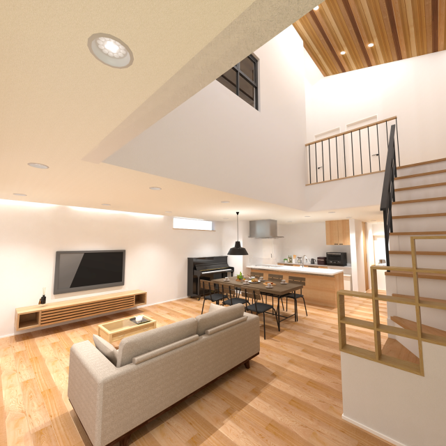「吹き抜けでも暑くない、寒くない。家族がつながる回遊動線の大空間の家」がテーマです。